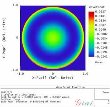 后來經(jīng)過繼續(xù)調(diào)節(jié)參數(shù)和優(yōu)化函數(shù),最后達到了要求。但是系統(tǒng)的長度較長,且由于個別鏡片的彎曲較大,使用彎月鏡來平衡系統(tǒng)的像差。彎月鏡的加工難度是比較大的,增加了生產(chǎn)成本。